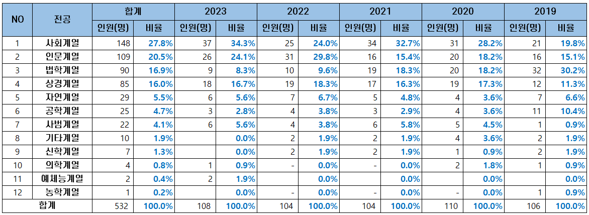 2019년부터 2023년까지 충남대 로스쿨 합격자의 학부 전공 현황은 아래 표와 같습니다.