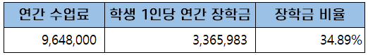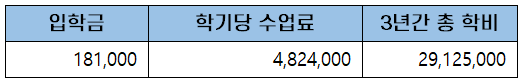 첫 학기 등록금은 입학금과 학기당 수업료를 합한 약 5백만 원이고, 이후 5학기 동안 등록금은 학기당 수업료를 내게 되어 3년간 총학비는 약 3천만 원(29,125,000원)입니다.