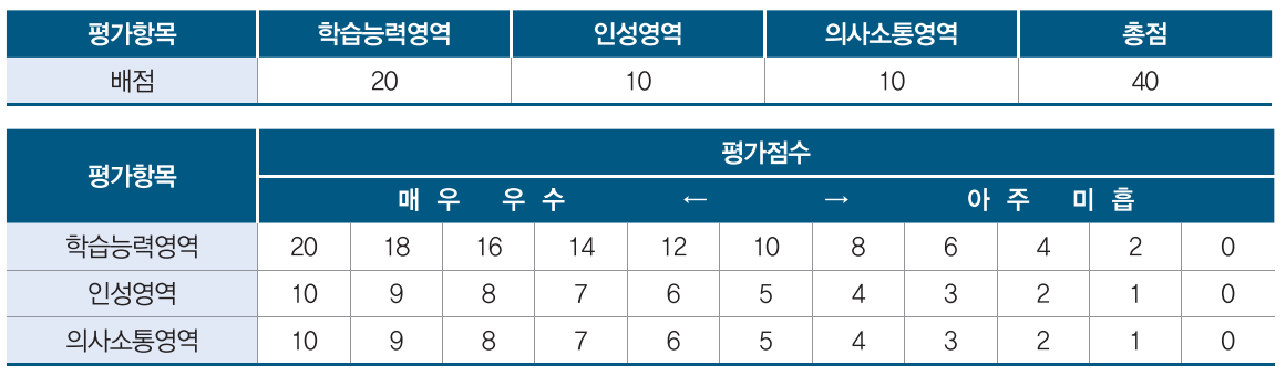 면접고사의 평가항목과 배점은 아래 표와 같습니다.