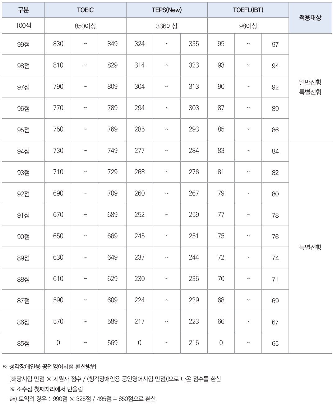 영어 성적은 100점 만점 기준으로 평가하고 있으며, 아래 환산표에 따라 토익, 텝스, 토플 IBT 성적을 환산합니다.