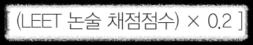2차 전형요소인 논술은 20점 만점으로 평가하며, 당해 연도 리트 논술영역을 활용하여 법학전문대학원 협의회에서 일괄 채점한 성적을 기준으로 아래 산식에 따라 환산합니다.
