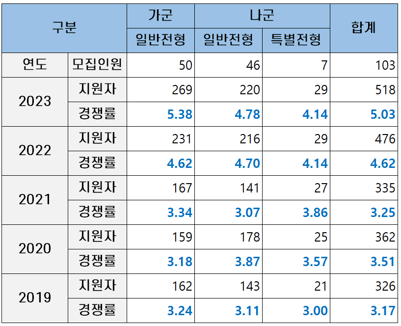 | 경쟁률 | 4.62 | 4.70 | 4.14 | 4.62 | |