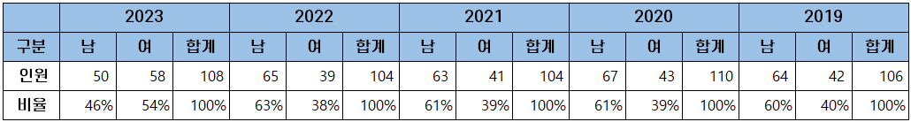 | 연도 | 모집인원 | 50 | 46 | 7 | 103 |