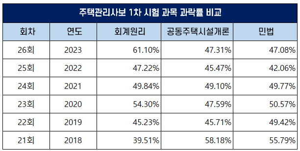 최근 시행된 주택관리사 1차 시험 민법 과목의 평균점수와 과락률을 아래 표로 정리했습니다.