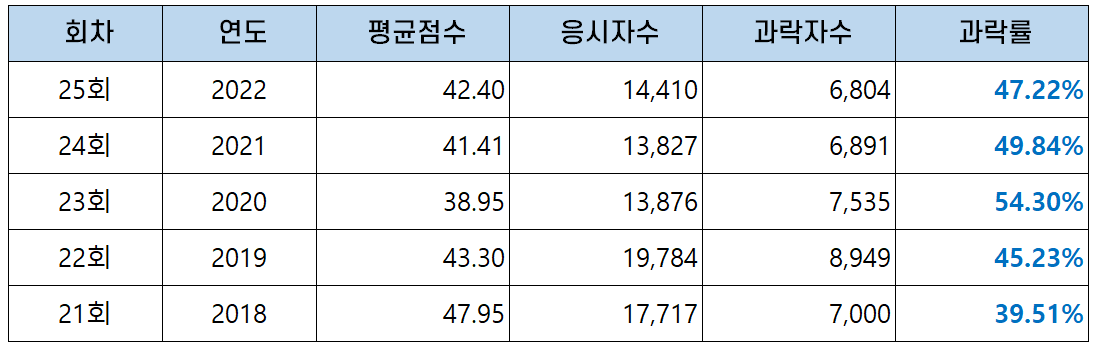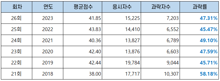 | 회차 | 연도 | 평균점수 | 과락률 |