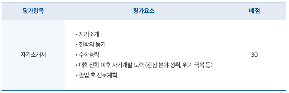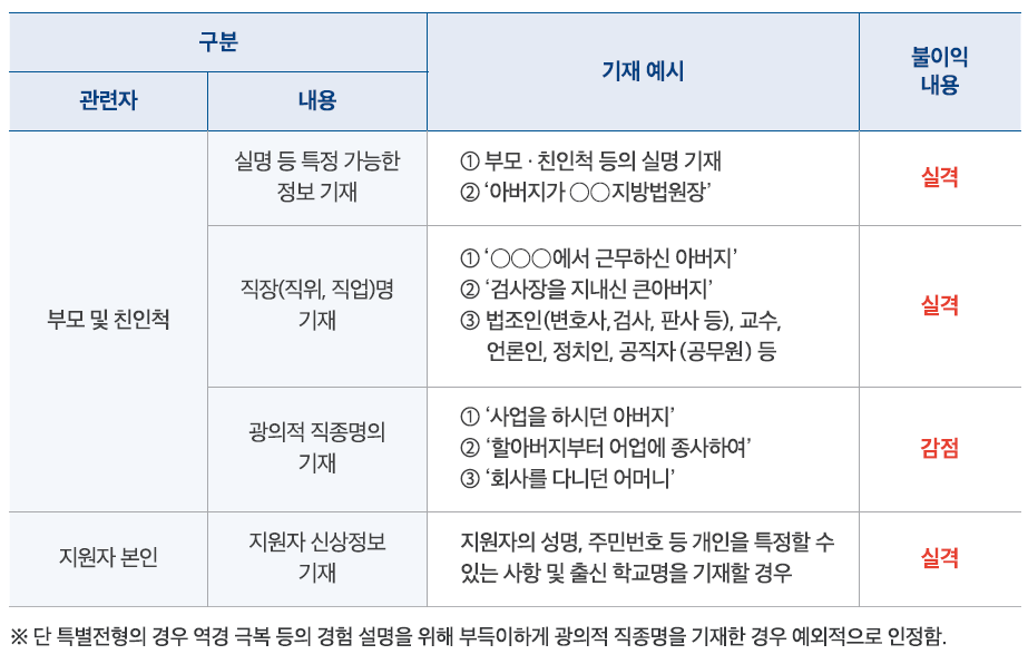 자기소개서, 기타 제출서류 등에 부모·친인척의 성명, 출신 대학명, 직업명, 직장명 및 본인의 개인 식별정보, 출신 학교명, 직장명 등 입학전형에서 특혜를 받거나 영향을 미칠 수 있는 사항은 기재를 금하며 위반 시 실격 또는 감점 처리합니다.