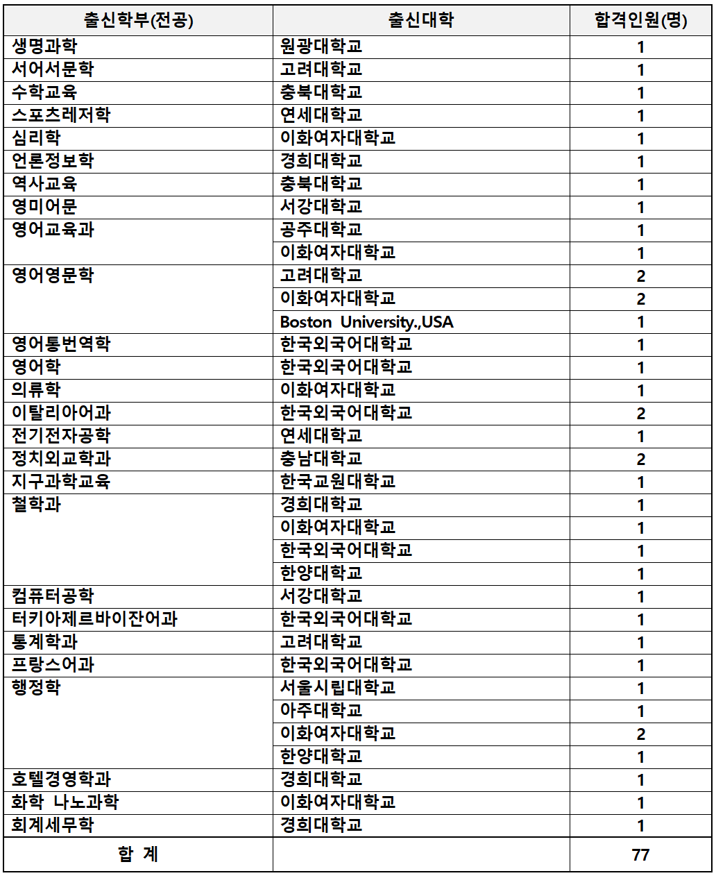 자퇴나 제적 등으로 결원이 생긴 인원을 모집 정원외로 선발해 매년 실제 합격인원은 70~77명 정도입니다.