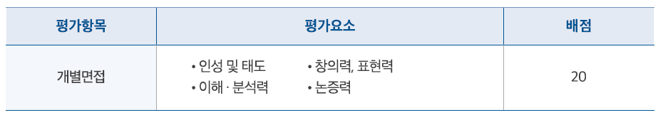 20점 만점 기준으로 평가하는 면접시험은 1차 전형 합격자를 대상으로 가번호를 부여하며 무자료로 구술 답변을 평가하는데요. 다음의 평가요소를 종합하여 평가하고 조정점수를 적용합니다.