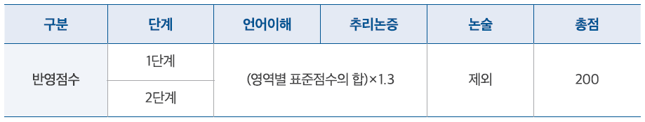 리트 성적은 200점 만점으로 평가하며, 언어이해 영역 점수와 추리논증 영역 표준 점수를 아래의 산출식에 따라 환산합니다.