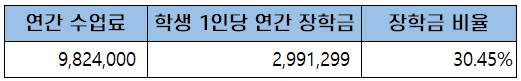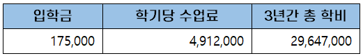 첫 학기 등록금은 입학금과 학기당 수업료를 합한 약 5백만 원(5,087,000원)이고, 이후 5학기 동안 등록금은 학기당 수업료를 내게 되어 3년간 총학비는 약 3천만 원(29,647,000원)입니다.
