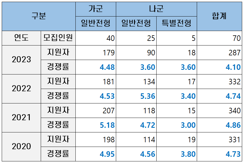 2023년에는 가군 일반전형 경쟁률이 4.48대 1, 나군 일반전형 경쟁률이 3.6대 1을 기록하며 지난해보다 하락했습니다.
