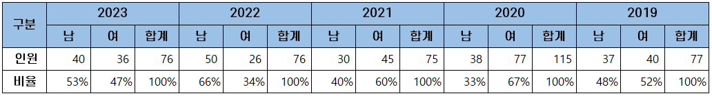 | 2023 | 지원자 | 179 | 90 | 18 | 287 |