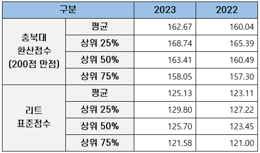 2022년과 2023년 충북대 로스쿨이 공개한 합격자들의 충북대 리트 환산점수(200점 만점 기준)와 위 산출식에 따라 다시 리트 표준 점수(언어이해와 추리논증 표준 점수 함계)로 환원한 성적은 아래 표와 같습니다.