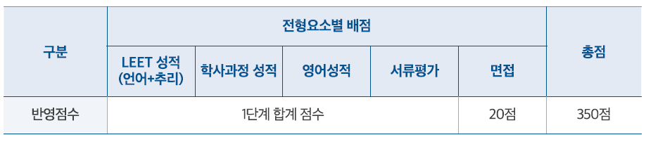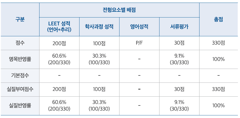 1단계 전형은 법학적성시험(LEET) 성적 200점, 학부 성적 100점, 서류평가 성적 30점으로, 합계 330점 만점 기준으로 평가합니다.