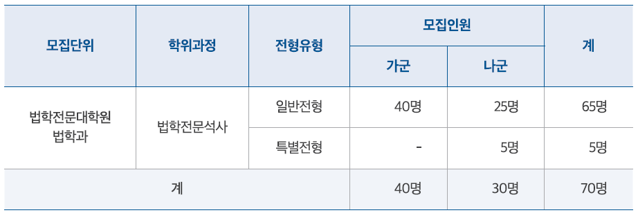 충북대 로스쿨은 가군에서 40명 나군에서 30명을 선발해 합계 70명을 모집합니다.