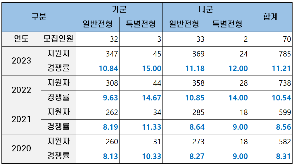 2023년에는 경쟁률이 더 상승해 가군 일반 전형 경쟁률이 10.84대1, 나군 일반 전형 경쟁률이 11.18대 1이었습니다.