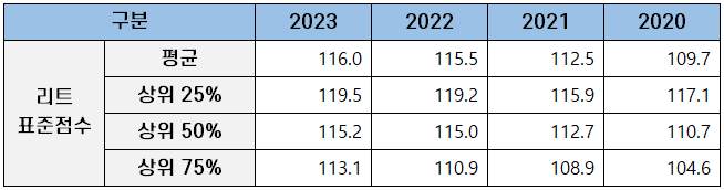 리트 성적은 아래 표준점수 변환표와 성적 분포를 정리한 포스팅을 참고하세요.