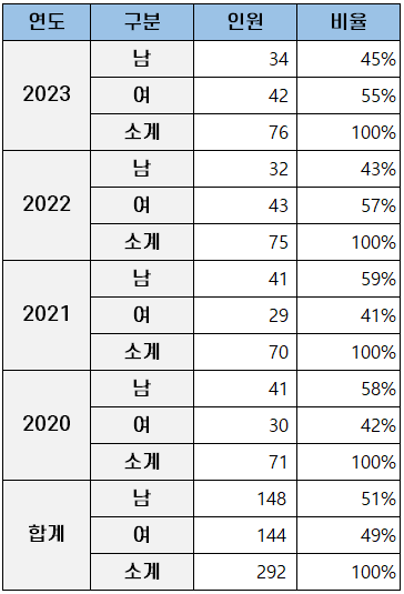 2020년부터 2023년까지 영남대 로스쿨 합격자의 성별 현황은 아래 표와 같습니다.