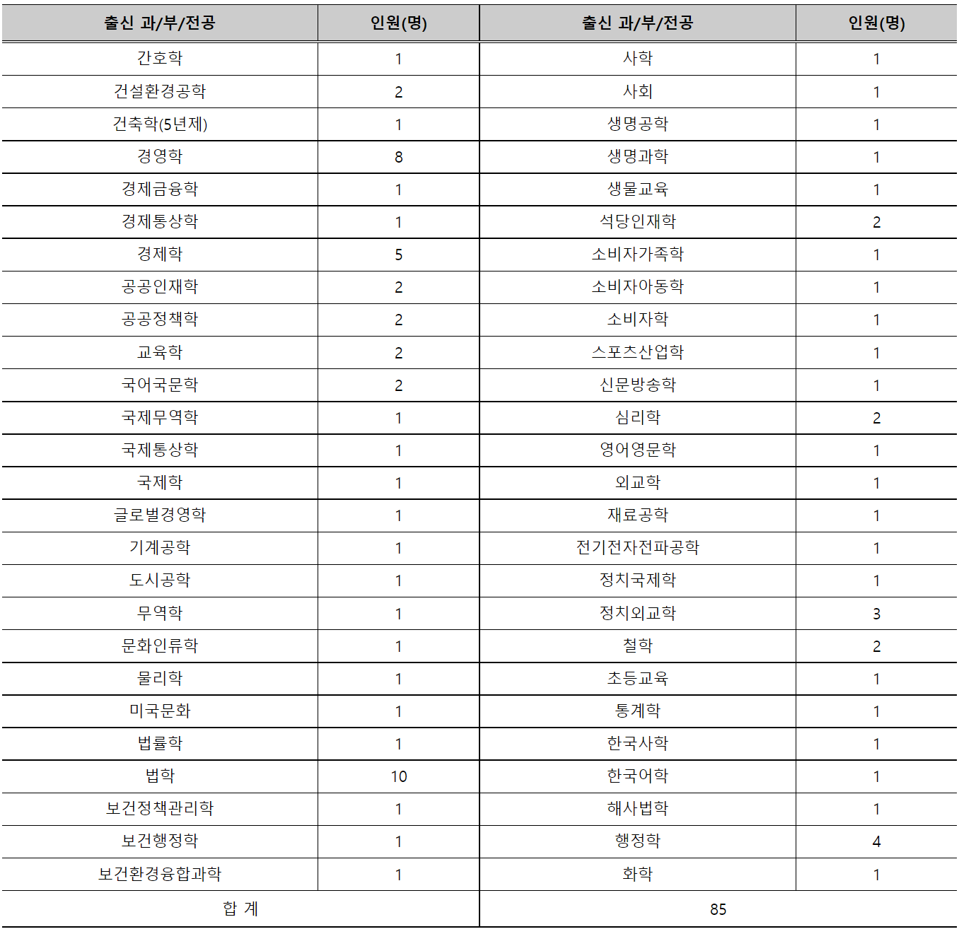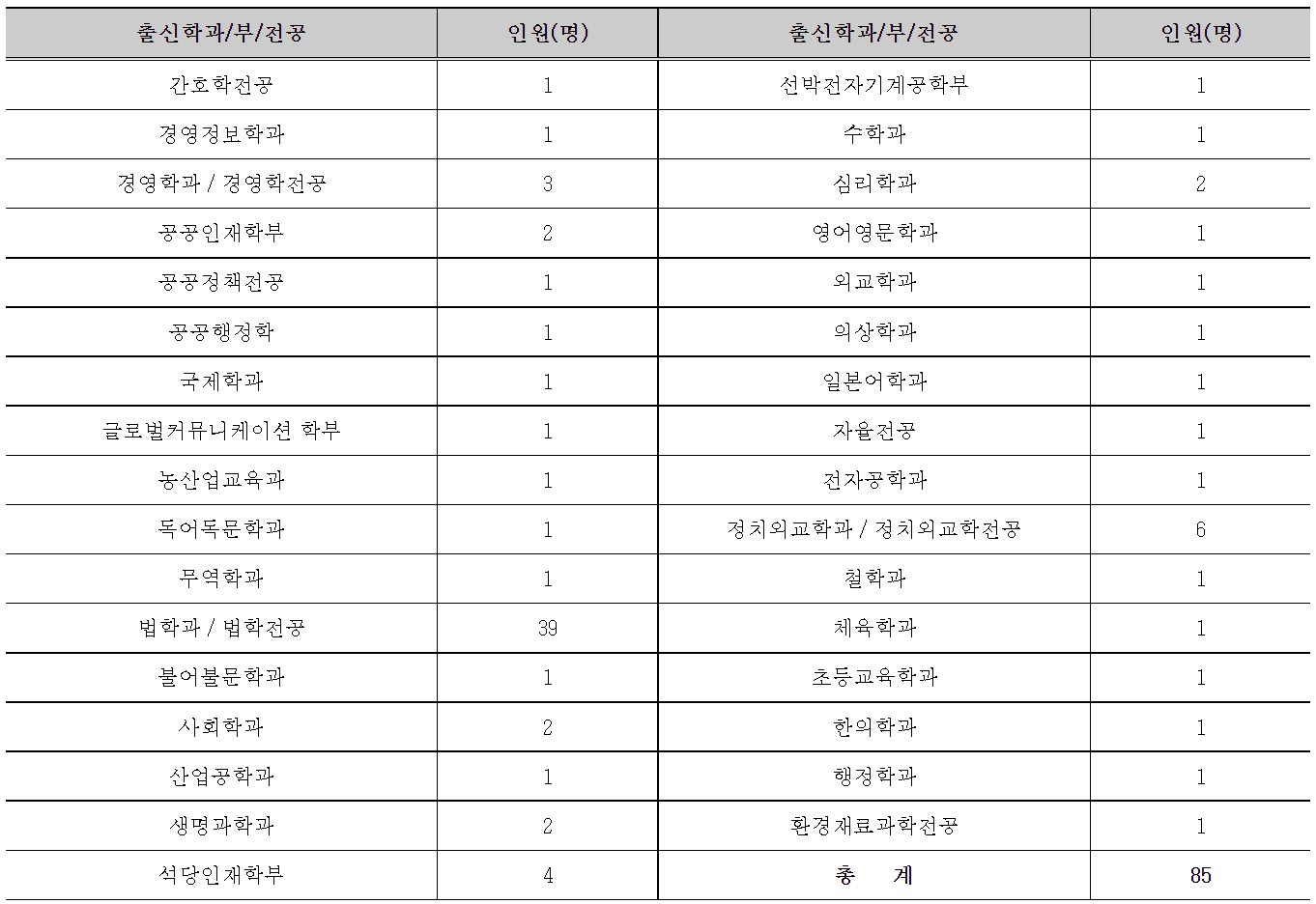2020년부터 2023년까지 동아대 로스쿨 합격자의 학부 전공 현황은 아래 표와 같습니다.