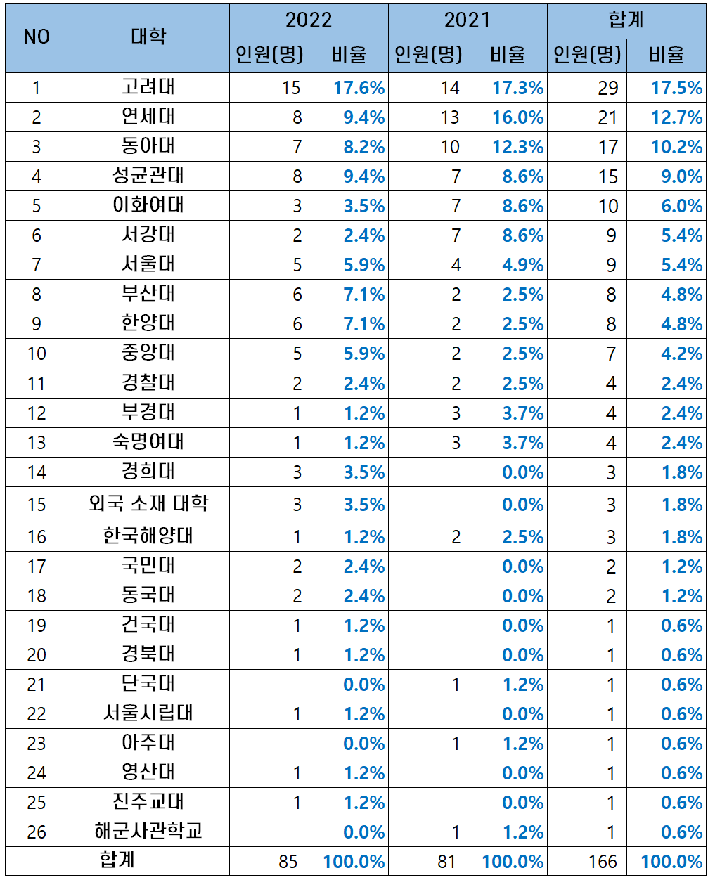 | NO | 대학 | 2022 | 2021 | 합계 |