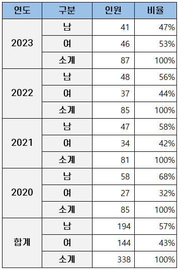 2020년부터 2023년까지 동아대 로스쿨 합격자의 성별 현황은 아래 표와 같습니다.