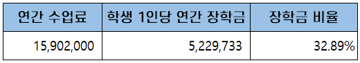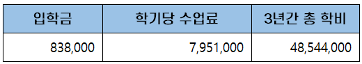 첫 학기 등록금은 입학금과 학기당 수업료를 합한 약 9백만 원(8,789,000원)이고, 이후 5학기 동안 등록금은 학기당 수업료를 내게 되어 3년간 총학비는 약 5천만 원(48,544,000원)입니다.