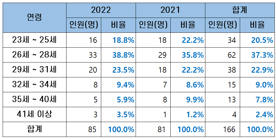 | 32세 ~ 34세 | 8 | 7 | 15 |