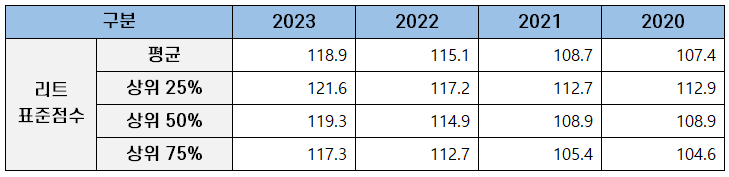 리트 성적은 아래 표준점수 변환표와 성적 분포를 정리한 포스팅을 참고하세요.