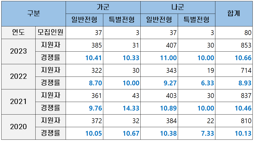 2023년에는 지난해보다도 경쟁률이 상승했는데요. 가군 일반 전형 경쟁률이 10.41대 1, 나군 일반전형 경쟁률이 11.00대 1을 기록했습니다.