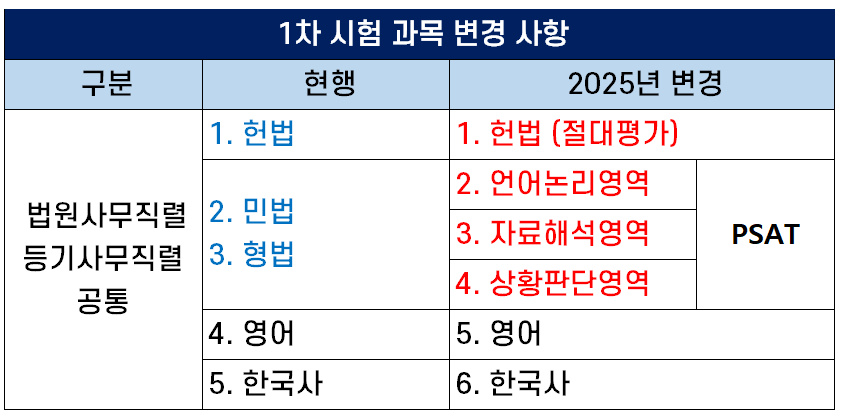 2025년부터 법원행시 1차 시험과목은 아래 표와 같이 민법과 형법 과목이 PSAT으로 대체되고, 헌법은 절대평가로 바뀝니다.