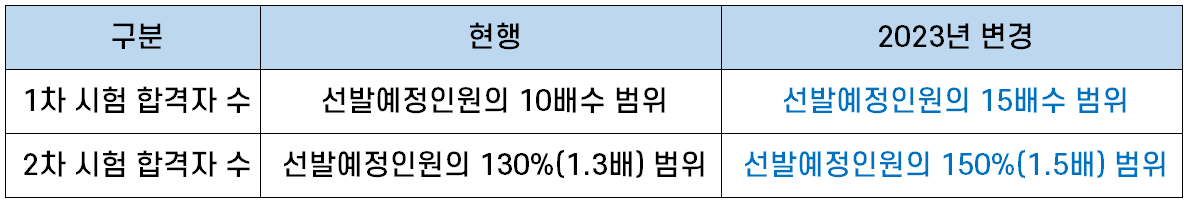 먼저 1차 시험과 2차 시험의 합격자 수가 2023년부터 아래 표와 같이 변경됩니다.