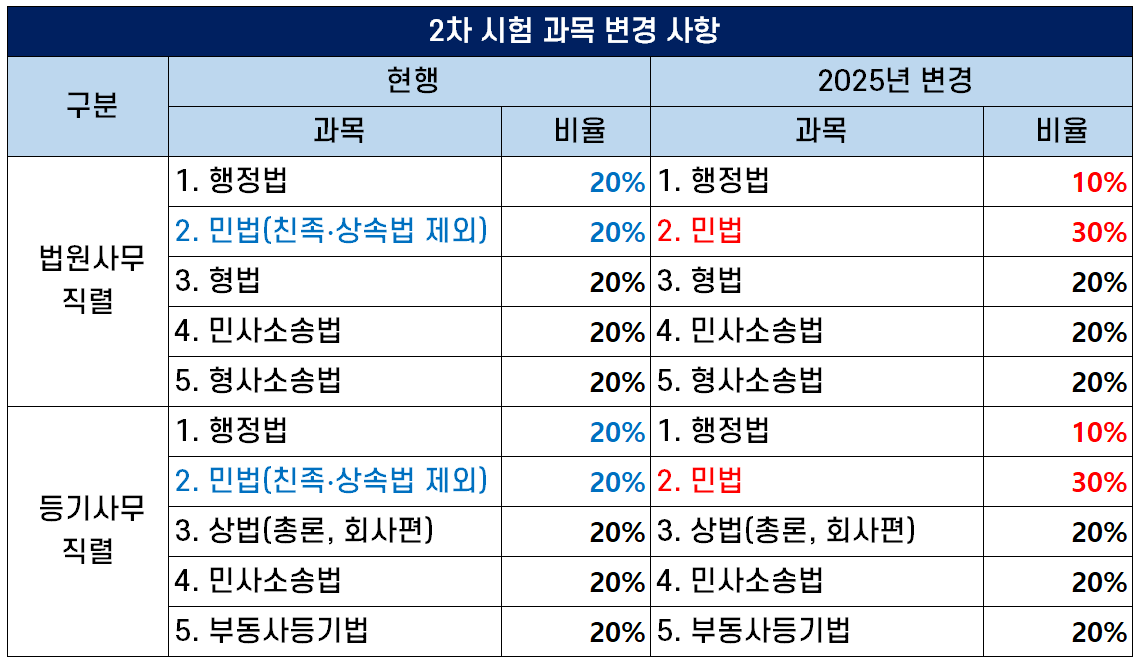 법원행시 1차 시험 과목에서 민법이 제외되면서 법원사무직과 등기사무직 모두 2차 시험 민법 과목의 범위가 친족·상속법을 포함하는 것으로 변경되었고, 반영비율도 20%에서 30%로 높아진 반면, 행정법의 반영비율이 10%로 낮아졌습니다.
