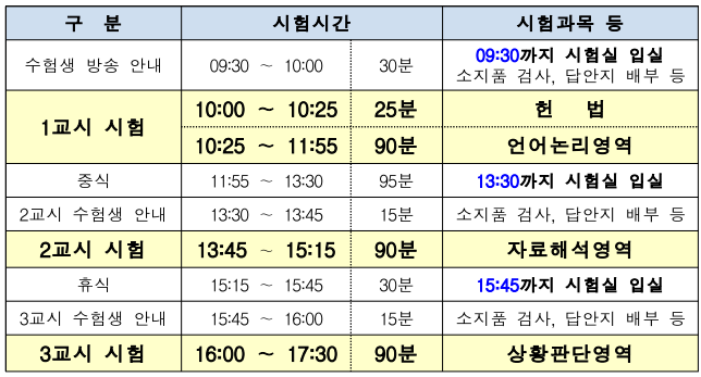헌법이 절대평가제로 변경되고 PSAT이 도입되면 법원행시 1차 시험이 5급 공채 1차 시험과 유사한 시간표로 시행될 것으로 보입니다(아래 5급 공채 1차 시간표 참고).