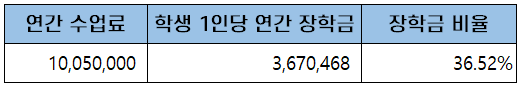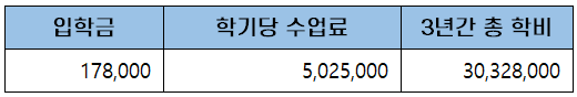 첫 학기 등록금은 입학금과 학기당 수업료를 합한 약 5백만 원(5,203,000원)이고, 이후 5학기 동안 등록금은 학기당 수업료를 내게 되어 3년간 총학비는 약 3천만 원(30,328,000원)입니다.