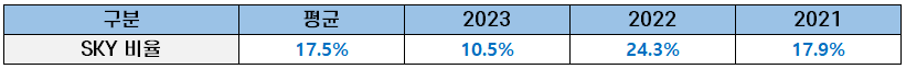 고려대, 연세대,서울대를 합한 SKY 대학 출신 비율이 평균 17.5%입니다.