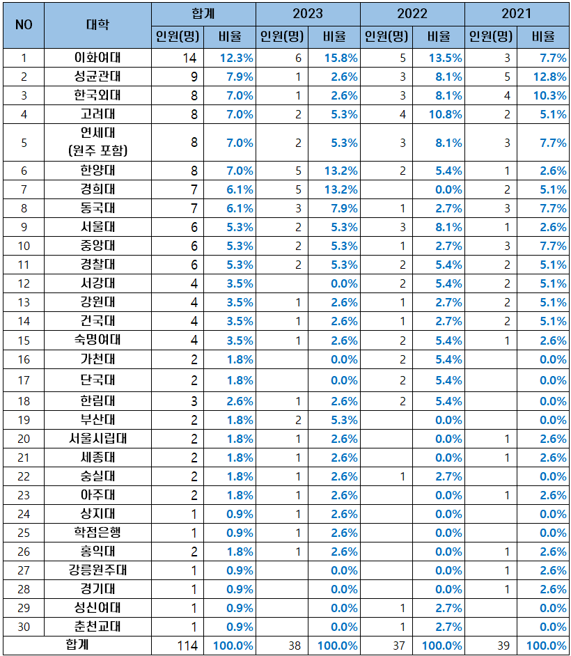 | NO | 대학 | 합계 | 2023 | 2022 | 2021 |