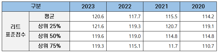 | 상위 25% | 121.6 | 119.3 | 120.7 | 119.1 |