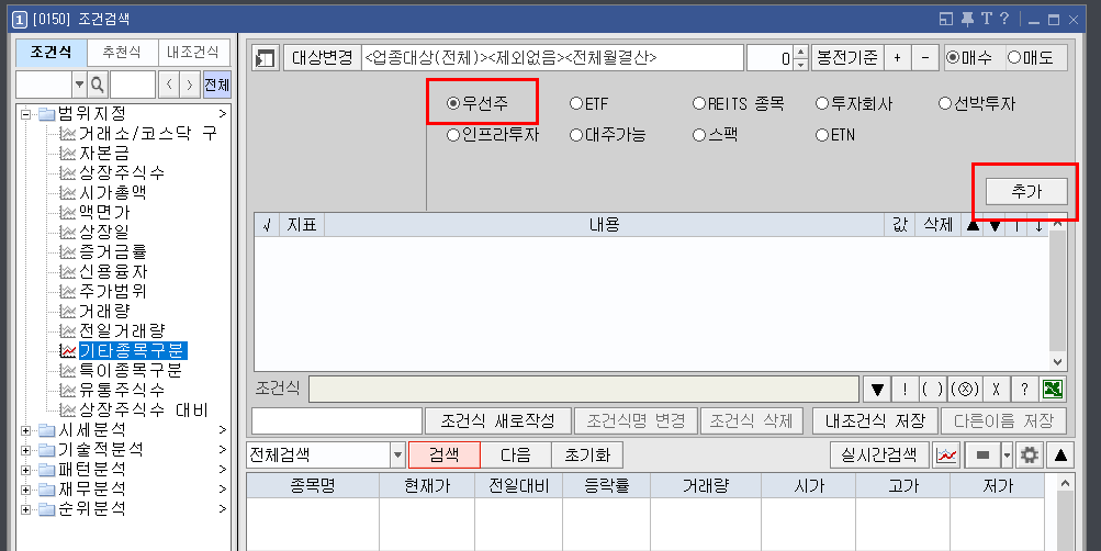 다음과 같이 조건식에 우선주가 추가되면 검색 버튼을 누릅니다.