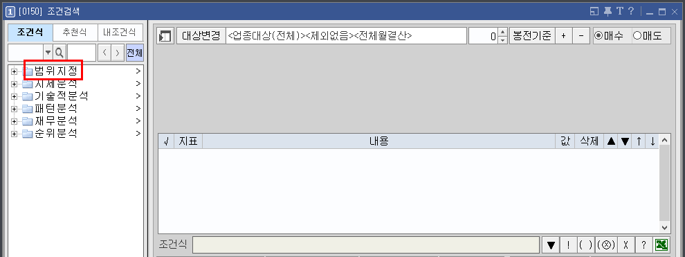 조건검색 화면 왼쪽에서 범위지정을 클릭합니다.