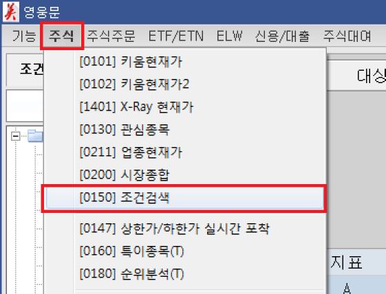 먼저 영웅문 상단 탭에서 주식을 클릭하고 [0150]조건검색을 클릭합니다.