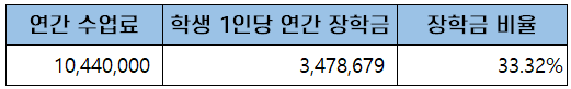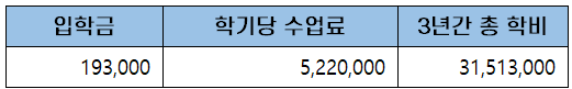 첫 학기 등록금은 입학금과 학기당 수업료를 합한 약 5백만 원(5,413,000원)이고, 이후 5학기 동안 등록금은 학기당 수업료를 내게 되어 3년간 총학비는 약 3천만 원(31,513,000원)입니다.