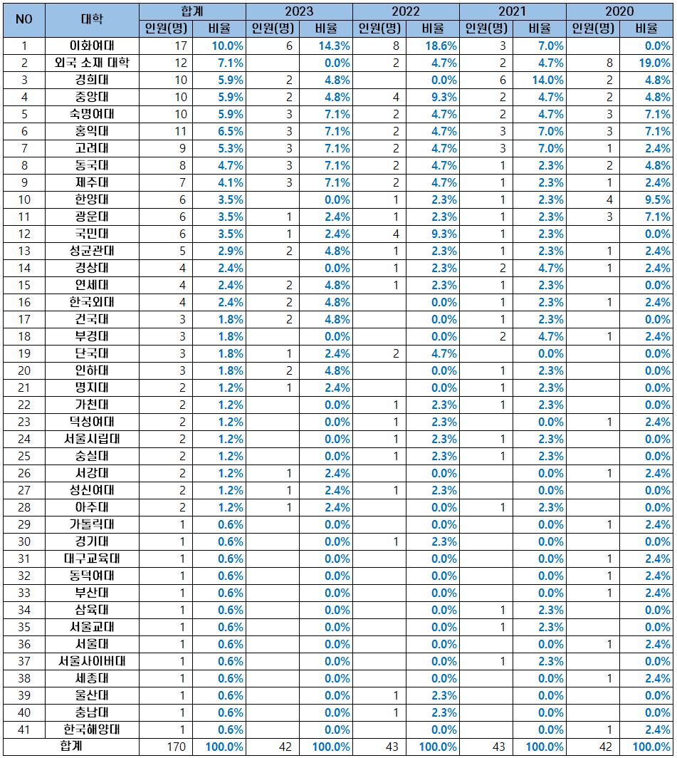 | NO | 대학 | 합계 | 2023 | 2022 | 2021 | 2020 |