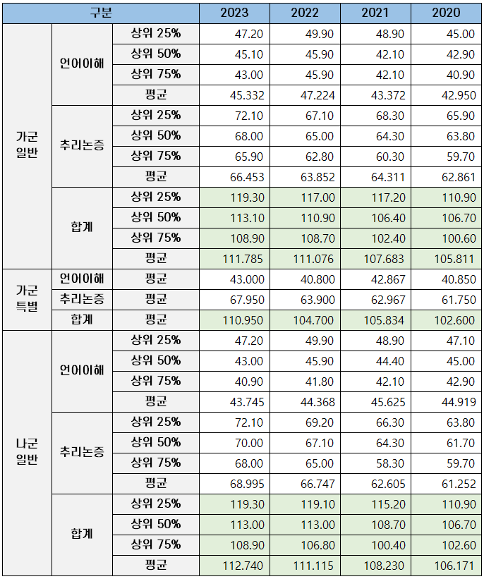 | 추리논증 | 상위 25% | 72.10 | 69.20 | 66.30 | 63.80 | |