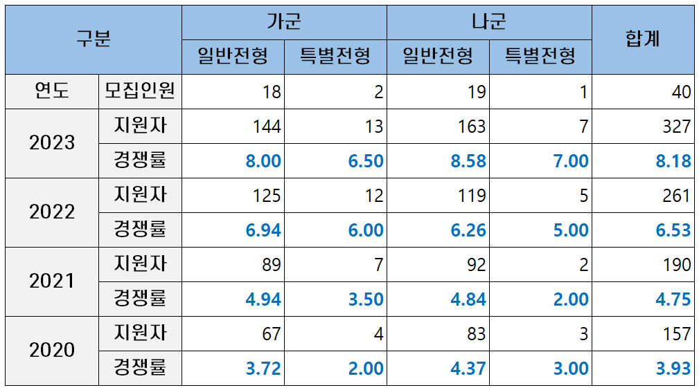 2023학년도 입학 경쟁률은 지난해보다도 상승했는데요. 가군 일반전형이 8.00대 1, 나군 일반전형이 8.58대 1의 높은 경쟁률을 기록했습니다.