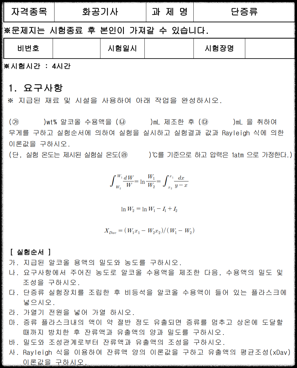 화공기사 작업형 실기 시험은 시험장에서 지급된 재료와 시설을 이용하여 요구사항에 맞는 작업(단증류)을 완성하는 형태로 출제됩니다. 상세한 실기시험 문제와 지급 재료는 첨부한 파일을 참고하세요.