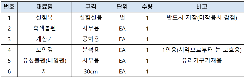 화공기사 실기시험 응시자는 실험복, 공학용계산기, 보안경 등 아래 수험자 지참 준비물을 준비해 가야 하는데요. 특히 실험복을 미착용할 경우 감점되니 주의하시기 바랍니다.