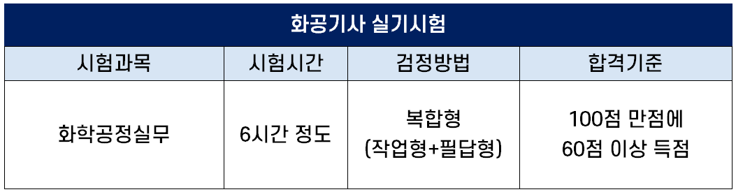 실기시험 과목은 화학공정실무로 작업형과 필답형이 혼합된 복합형으로 출제되는데요. 시험시간은 작업형이 4시간 정도, 필답형이 2시간이며, 100점 만점에 60점 이상 득점하면 합격입니다.