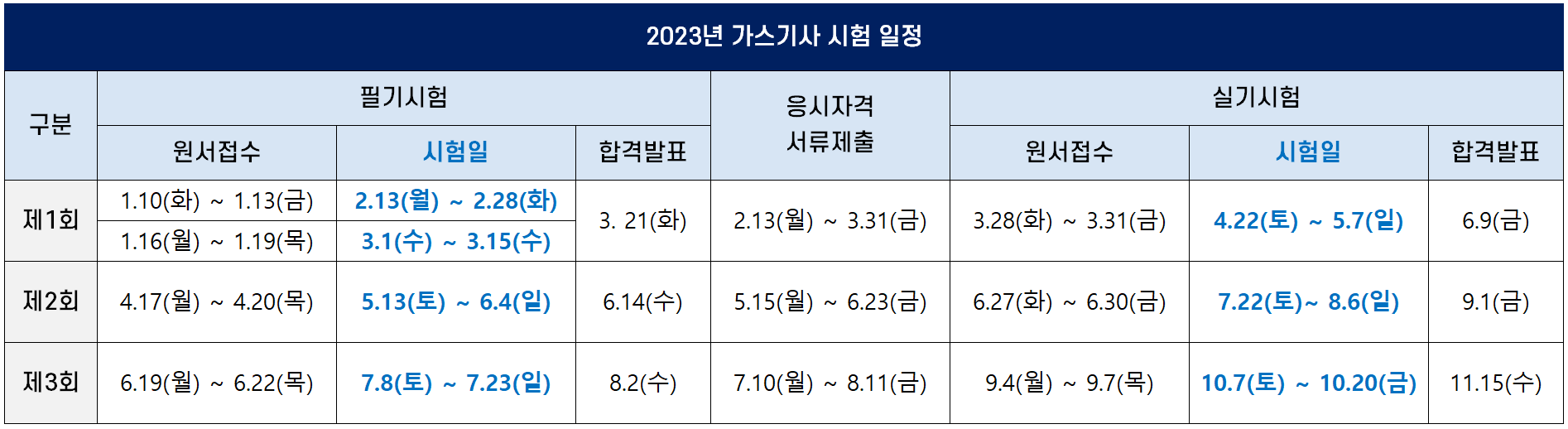 가스기사 자격시험은 매년 3번의 필기시험과 실기시험이 실시되는데요. 한국산업인력공단(Q-Net)이 시행하는 정기 기사 1회, 2회, 3회 차 시험 일정에 따라 시험이 실시됩니다.
