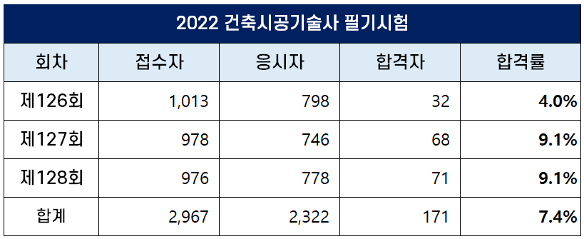 아래 표에서 보는 것처럼 2022년 건축시공기술사 필기시험에는 총 2,967명이 원서접수를 했는데요. 이 중 2,322명이 필기시험에 응시했고 171명이 합격을 해 2022년 필기 합격률은 7.4%입니다.