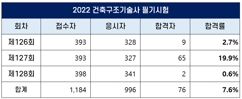 제126회 건축구조기술사 필기 합격률은 2.7%를 기록했고 제127회 합격률은 19.9%로 가장 높았으며, 128회 필기시험에서는 응시자 341명 중 단 2명이 합격을 해 합격률은0.6%로 매우 낮았습니다.